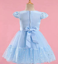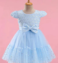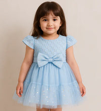Dress your little one in elegance with this enchanting Sky Blue Party Dress. Designed with delicate lace on the bodice, a statement bow at the waist, and a layered tulle skirt adorned with subtle shimmer, this dress is perfect for birthdays, weddings, and festive occasions. Soft inner lining ensures comfort, while the flare design adds a charming twirl effect your child will love.