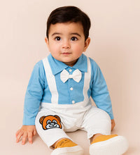 Dress your little one in this adorable formal romper featuring a sweet bow tie and teddy patch, paired with a trusted Pampers New Baby-Dry pack to keep your baby dry and happy all day long.