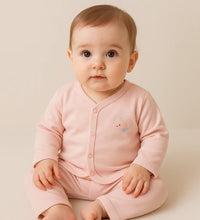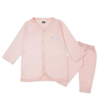 0 Months to 24 Months. 'Plain Light Peach Color' Baby 2-Piece Sleepsuit - designed as an all-season outfit, features a stylish cotton ensemble, including a long-sleeved shirt with convenient front snap buttons and matching trousers with an elastic waistband, ensuring an easy and soft cozy experience for babies.