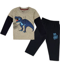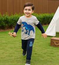 The set includes a light grey long-sleeve t-shirt featuring a bold and vibrant blue roaring T-Rex graphic, sure to capture your child's imagination. The contrasting navy blue long sleeves add a stylish touch. Paired with comfortable navy blue joggers, which also feature a fun "ROAR!" print on the leg, this set offers a snug yet flexible fit. Both pieces are crafted from a soft, high-quality cotton blend, ensuring warmth and breathability.